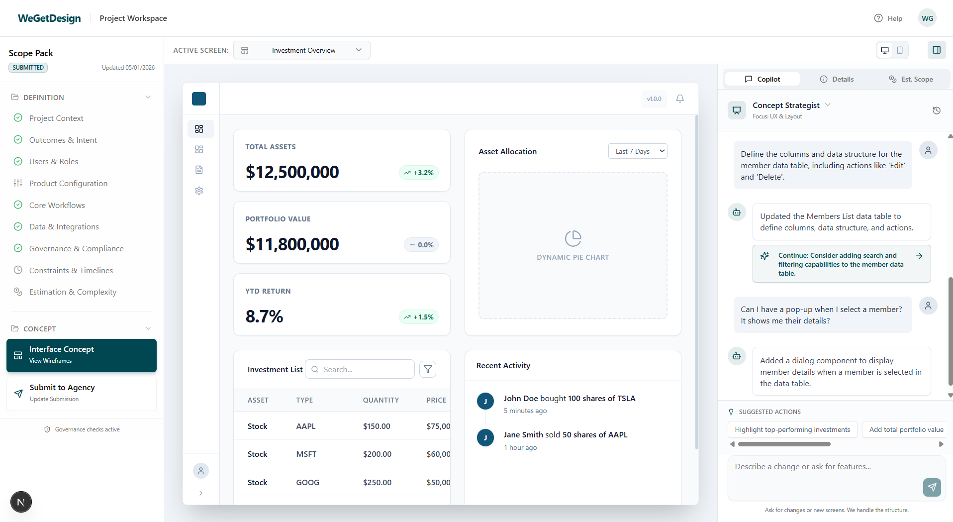 We translate discovery into clear system designs — interfaces, data models, and permissions — ensuring everyone is aligned before development.