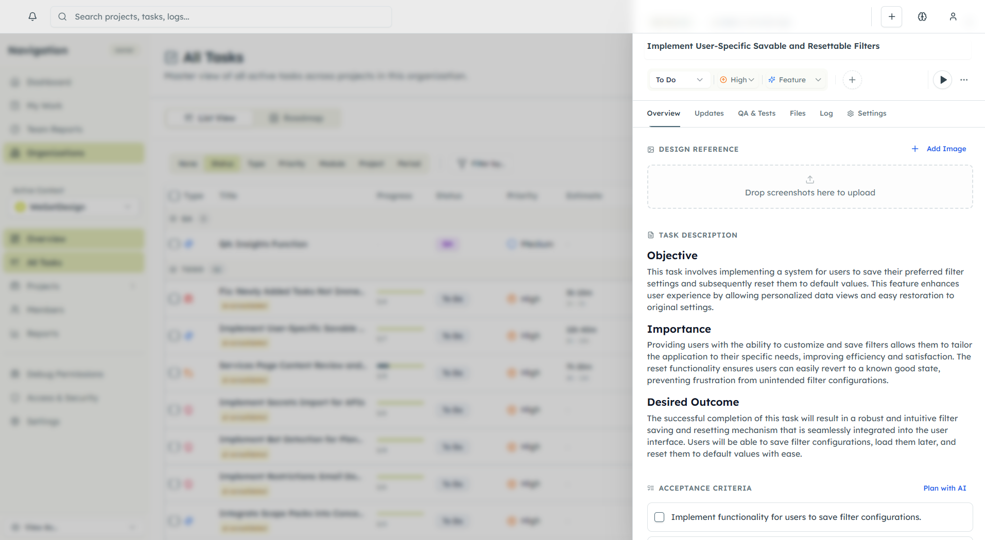 Every task is defined with an objective, importance, desired outcome, and acceptance criteria — reducing ambiguity and rework.